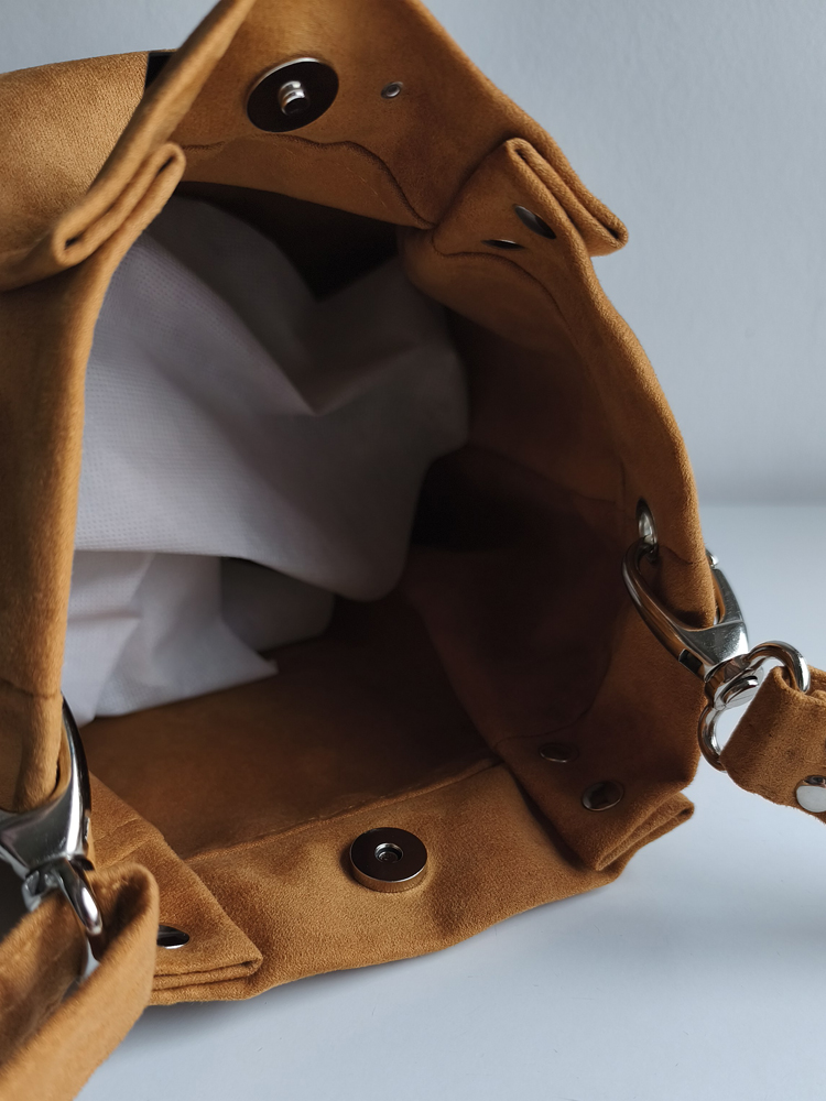 Made from high-quality faux suede, the Bucket Bag can be worn on the shoulder or cross-body. It features a detachable, adjustable strap - our signature Thin Belt - which transforms into a standalone ninaluba statement Belt when removed. One accessory, multiple styling possibilities.