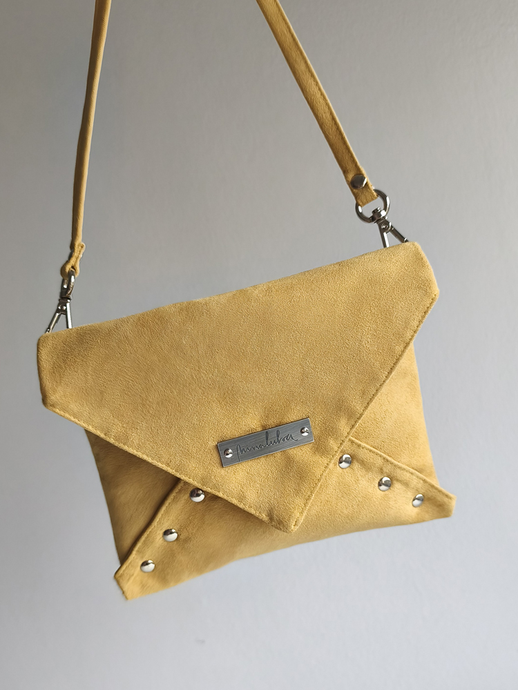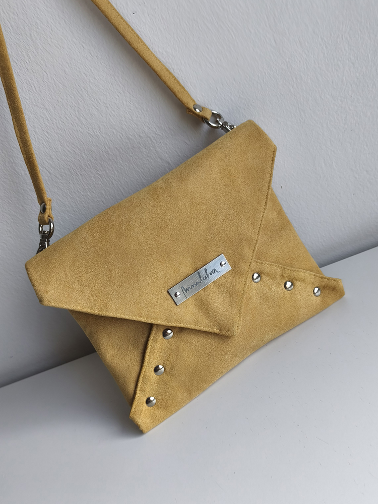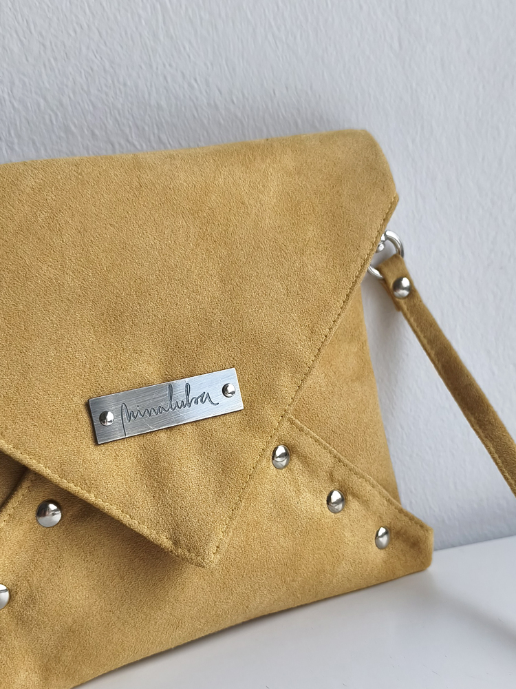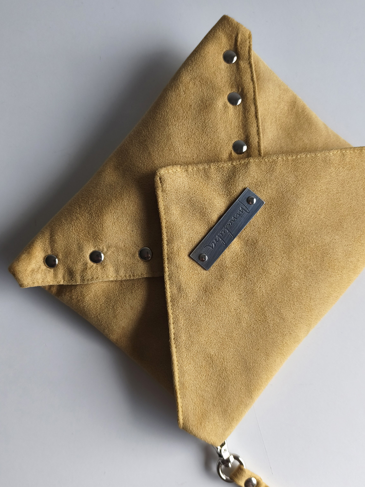 Crafted from soft faux suede, both inside and out, the Love Letter Bag offers a fully lined interior sized to hold a small wallet or coin purse, your phone, and a few essential beauty items. Its compact proportions make it perfect for day-to-night wear, whether styled on the shoulder or across the body.