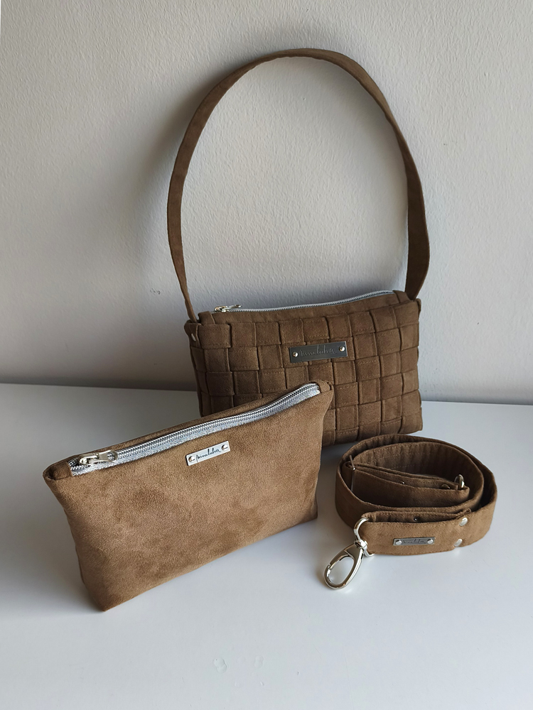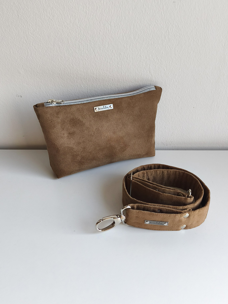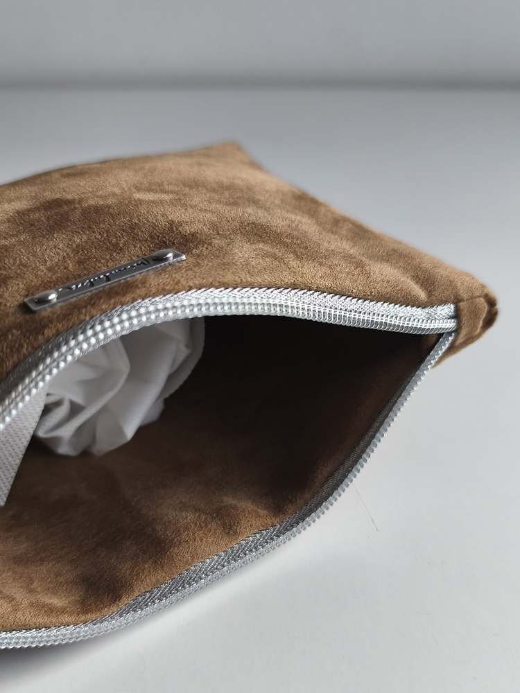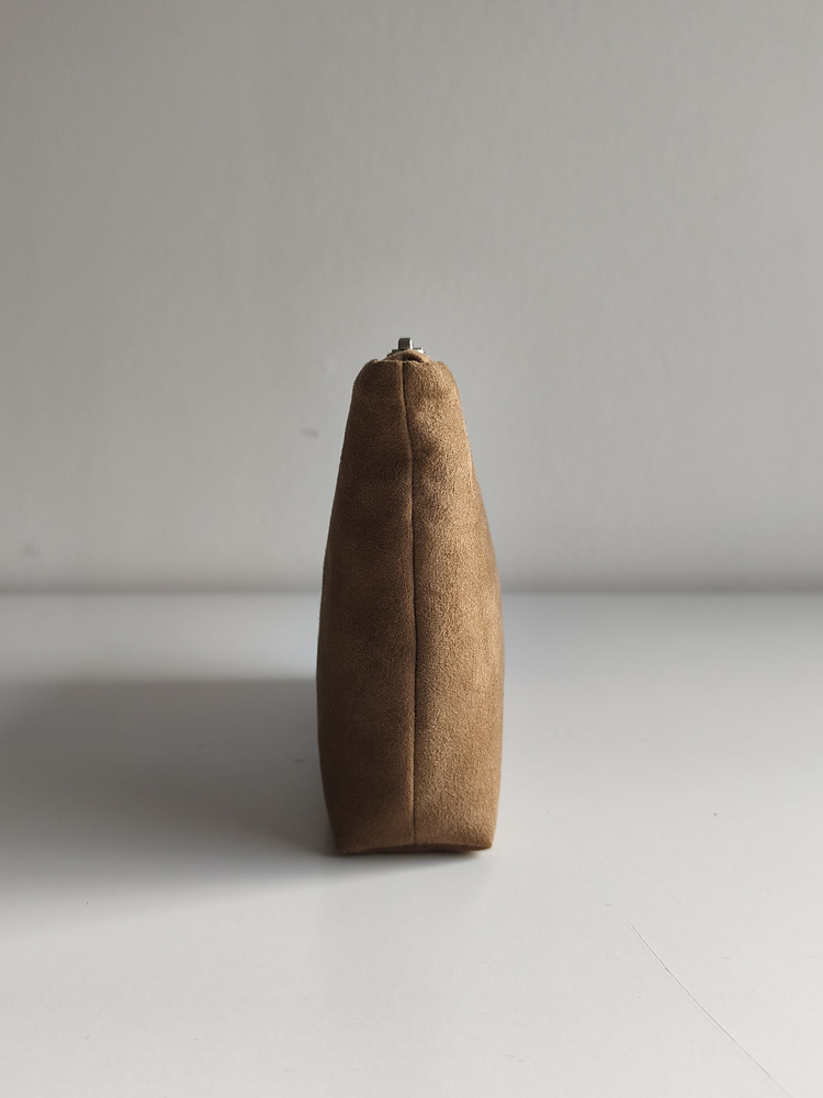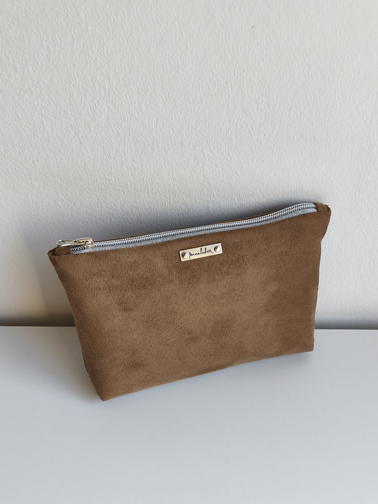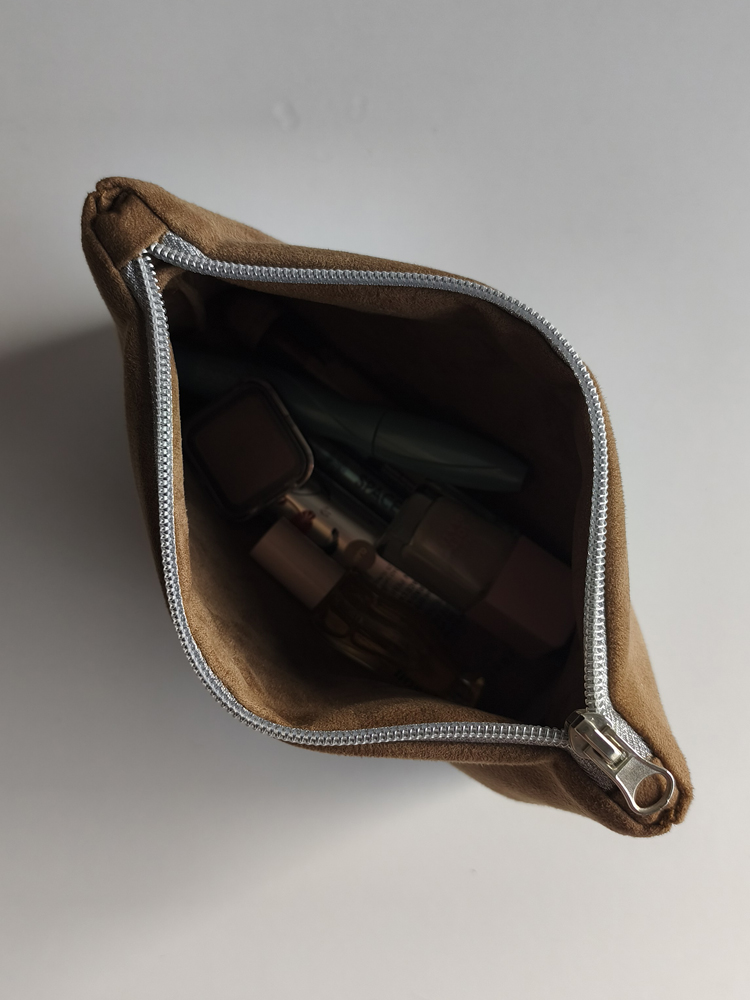 The ninaluba Cosmetic Bag is a distinctive, handcrafted accessory made by the designer herself. Crafted from soft faux suede, it features a decorative zipper and a fully lined interior, designed to keep your beauty essentials neatly organized. A silver-patina brand logo adds a subtle, refined finishing touch.
