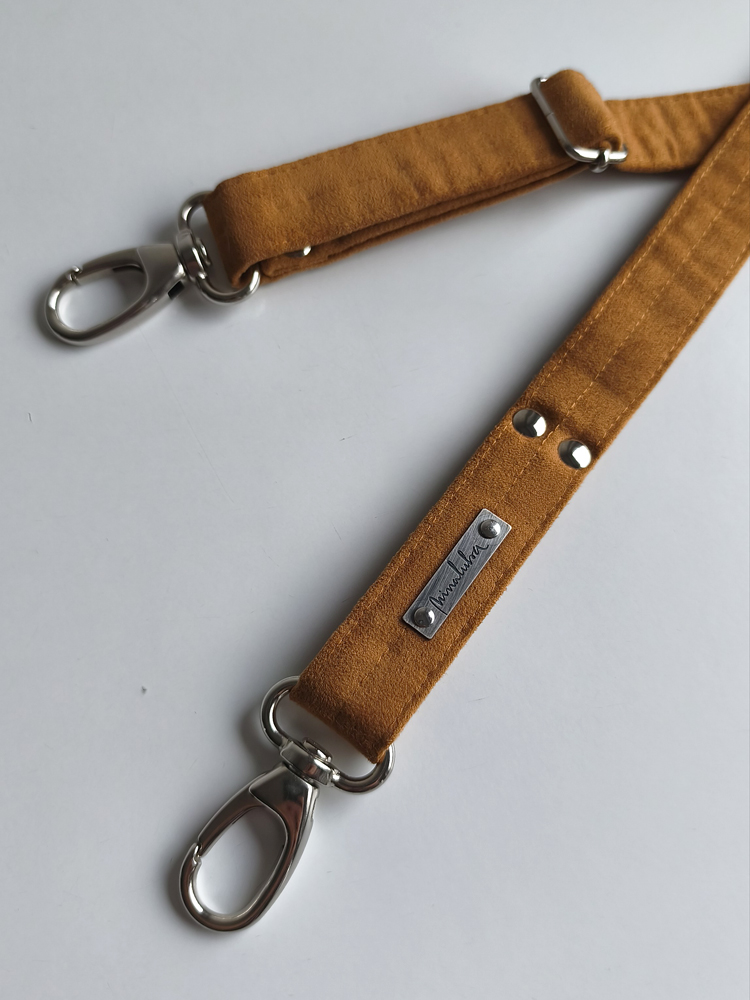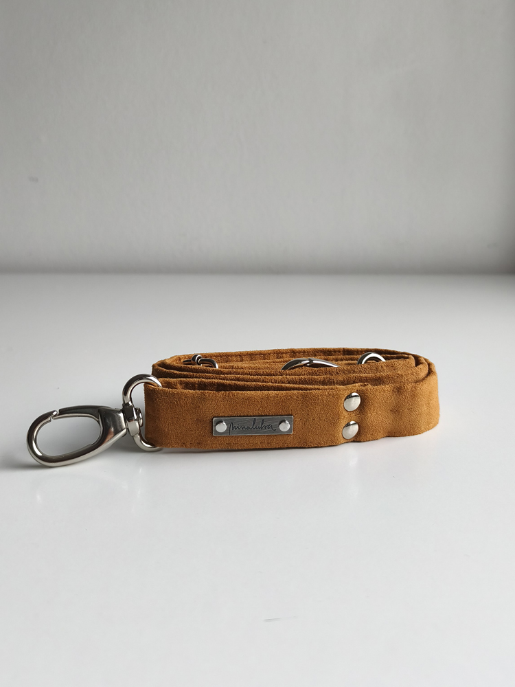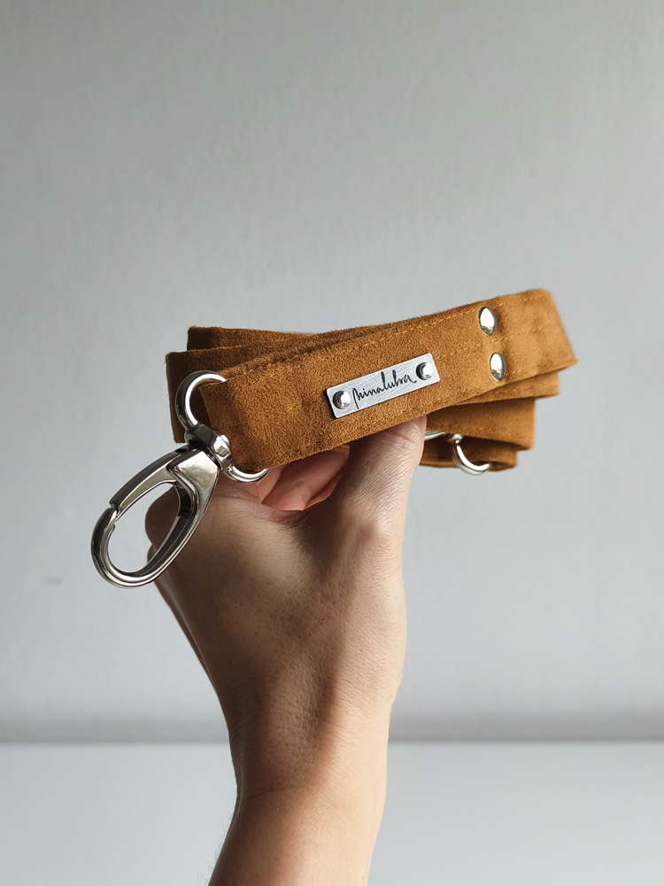 Handcrafted and unique, with its signature carabiner clasps and silver-patina brand logo.