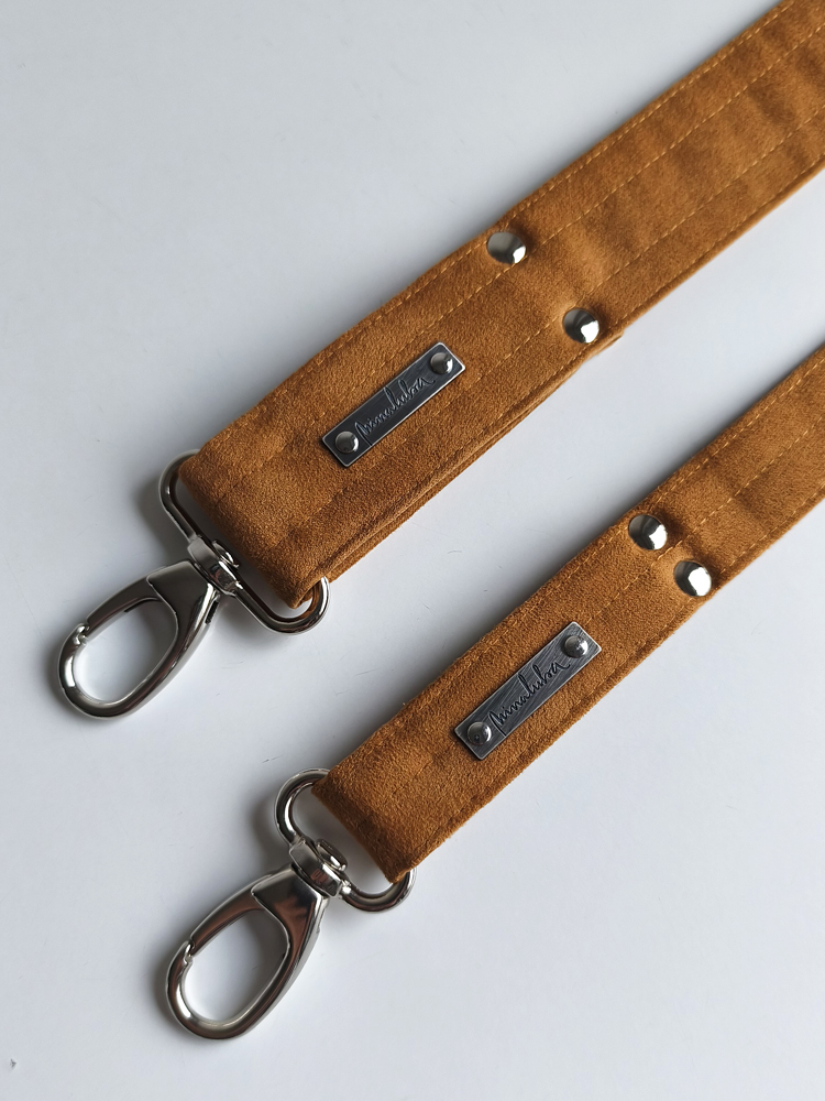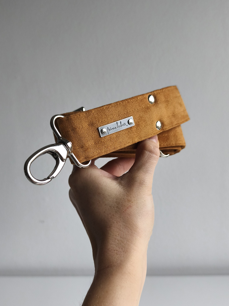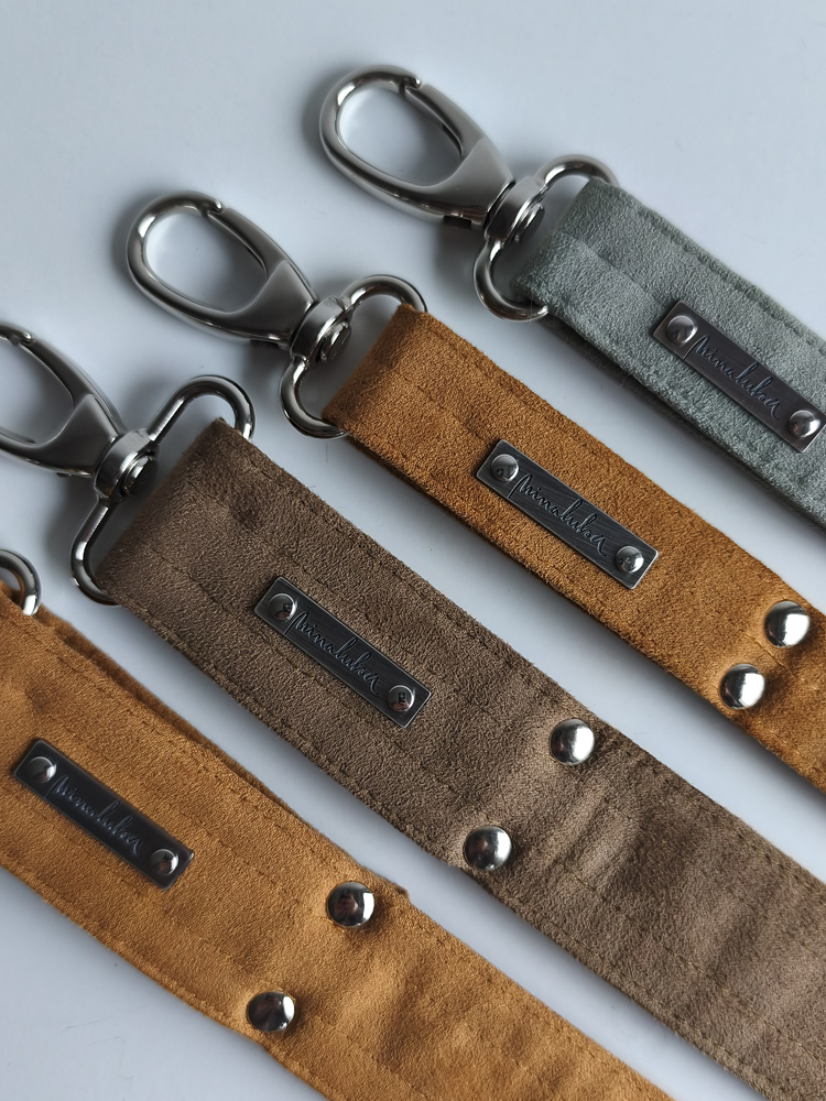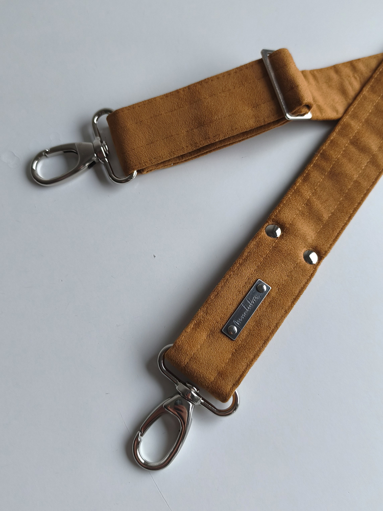 Handcrafted and unique, with its signature carabiner clasps and silver-patina brand logo.